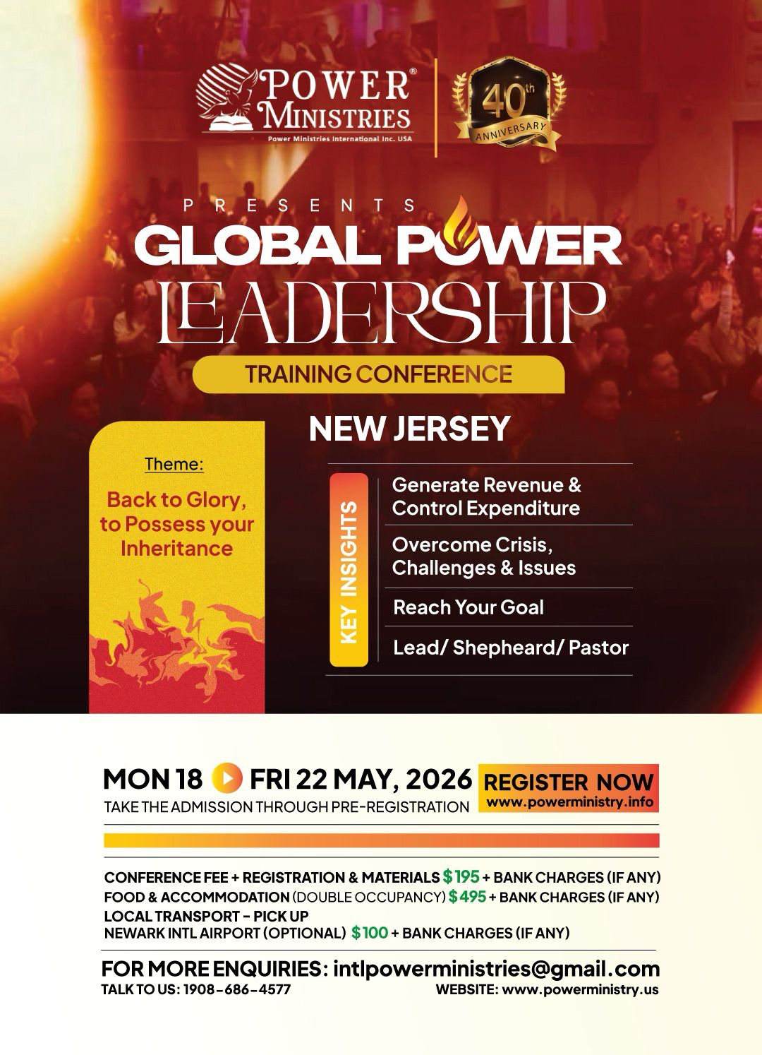 2026 May Global Power Leadership Training Conference - New Jersey, USA. It is a 5-Day intensive practical leadership training program. From Monday, May 18th to Friday May 22nd, 2026. Upon Registration and Payment, we will send you the letter of Invitation to process your visa (if visa is needed).